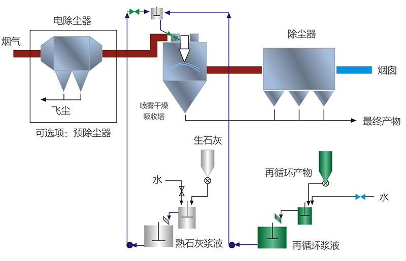 SDA一般使用生石灰(CaO) 作為吸收劑, 生石灰經(jīng)過(guò)消化后制成熟石灰漿液, 旋轉(zhuǎn)霧化器將吸收劑漿液霧化成億萬(wàn)個(gè)細(xì)小霧滴, 高溫?zé)煔膺M(jìn)入吸收塔后, 立即與呈強(qiáng)堿性的吸收劑霧滴接觸, 煙氣中的酸性成分(HCL、HF、SO2 、SO3 ) 被吸收, 同時(shí)霧滴的水分被蒸發(fā),變成干燥的脫酸產(chǎn)物。